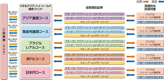 - ・各ファンドは、「アモーヴァ アジア・ハイ・イールド・ボンド・ファンド」、「ライオン アジア・ハイ・イールド・ボンド・ファンド」および「マネープールマザーファンド」を主要投資対象とします。